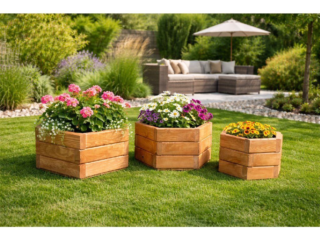Vnesite v svoj dom ali vrt eleganten in praktičen dodatek v obliki kompleta 3 lesenih cvetličnih loncev. Izdelani iz kakovostnega masivnega lesa združujejo naravno estetiko in dolgo življenjsko dobo. Idealni so za gojenje cvetja, zelišč ali zelenjave, hkrati pa predstavljajo odličen dekorativni element tako v notranjih kot zunanjih prostorih.
