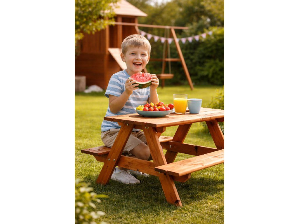 Ustvarite svojim otrokom varno, udobno in navdihujoče mesto za igro, ustvarjanje in počitek kar na vašem vrtu. Ta lesena vrtna miza za otroke iz kakovostnega smrekovega lesa je idealna rešitev za vsako družino, ki daje prednost naravnim materialom, trajnosti in brezčasnemu dizajnu.