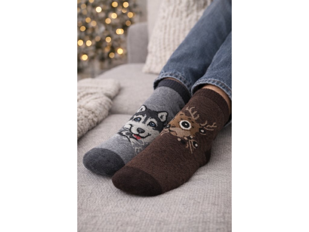 Grejo, ščitijo in trajajo. Moške nogavice iz naravne volne so idealna izbira za vse moške, ki cenijo kakovost, toplino in udobje. V enem paketu boste našli 2 para debelejših nogavic z originalnimi zimskimi motivi, ki bodo vaše noge zanesljivo grele tudi v najhladnejših dneh.