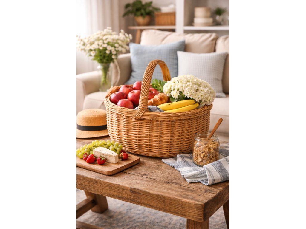 Celotna oblika košare je ovalna in uravnotežena, primerna za različne namene – od nabiranja sadja in zelenjave do piknikov ali nakupov. Košara je postavljena na zeleno travo, kar poudarja njen naraven značaj in tradicionalno rokodelstvo. Je preprost, a funkcionalen in estetski predmet, ki se poda v vsak dom.