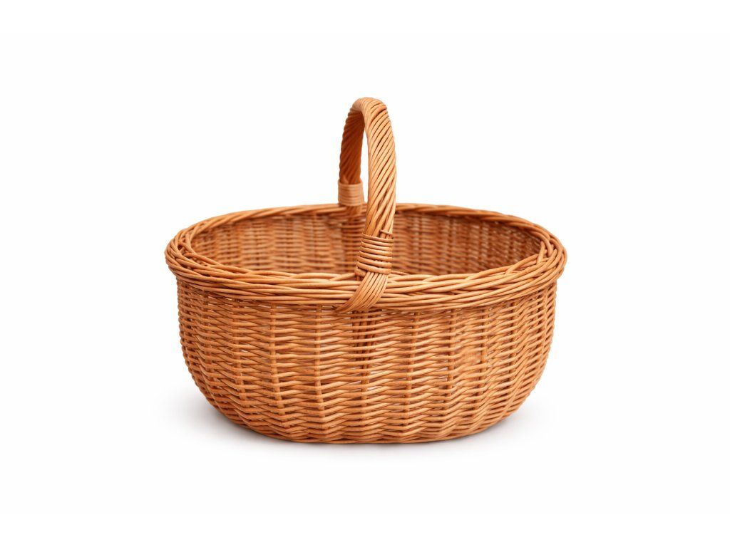 Na sliki je tradicionalna pletena košara z zaobljenim dnom in mehkim, naravnim odtenkom protja. Koš ima preprosto, a robustno zasnovo, kjer so palice lepo spletene v gosto strukturo, ki zagotavlja zadostno trdnost in vzdržljivost. Celotna košara je sestavljena iz enotnih svetlo rjavih palic, brez izrazitih barvnih kontrastov in okraskov, kar ji daje enoten in klasičen videz.