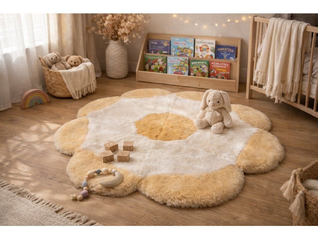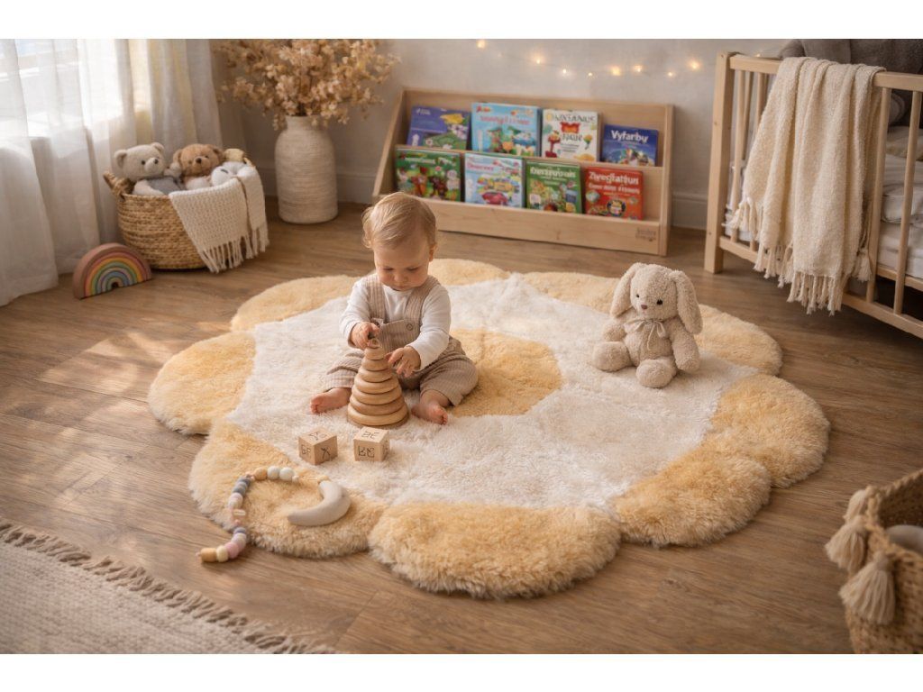 Popestrite sobo z igrivo preprogo v obliki rože iz prave ovčje kože. Ta oblikovalski kos ni le lep dodatek, temveč predvsem praktična in naravna izbira za vsakega otroka. Ovčja koža je znana po svojih izjemnih lastnostih - je mehka, topla, hipoalergena in antibakterijska. Zahvaljujoč tem prednostim boste ustvarili varen in udoben prostor za igro, sproščanje in prve korake.