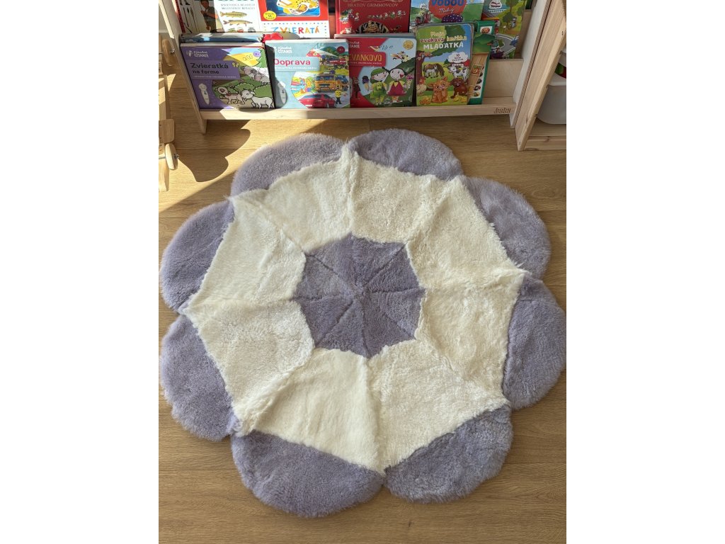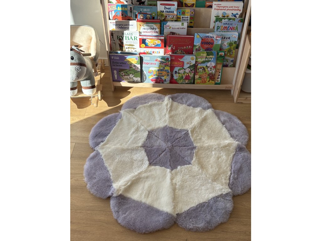 Preproga ima izvirno obliko vijolična, ki jo bodo otroci takoj vzljubili. Njena mehka struktura in naravni sijaj ovčje kože ustvarjata občutek razkošja in udobja. Zahvaljujoč uporabljenim naravnim materialom je preproga ekološka, trajnostna in nežna do otroške kože.