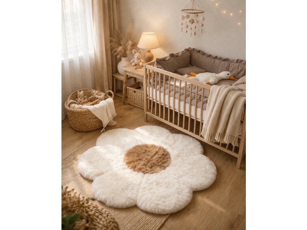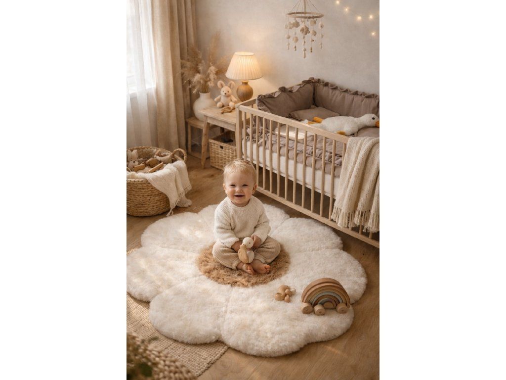 Preproga ima izvirno obliko rože, ki jo bodo otroci takoj vzljubili. Njena mehka struktura in naravni sijaj ovčje kože ustvarjata občutek razkošja in udobja. Zahvaljujoč uporabljenim naravnim materialom je preproga ekološka, trajnostna in nežna do otroške kože.