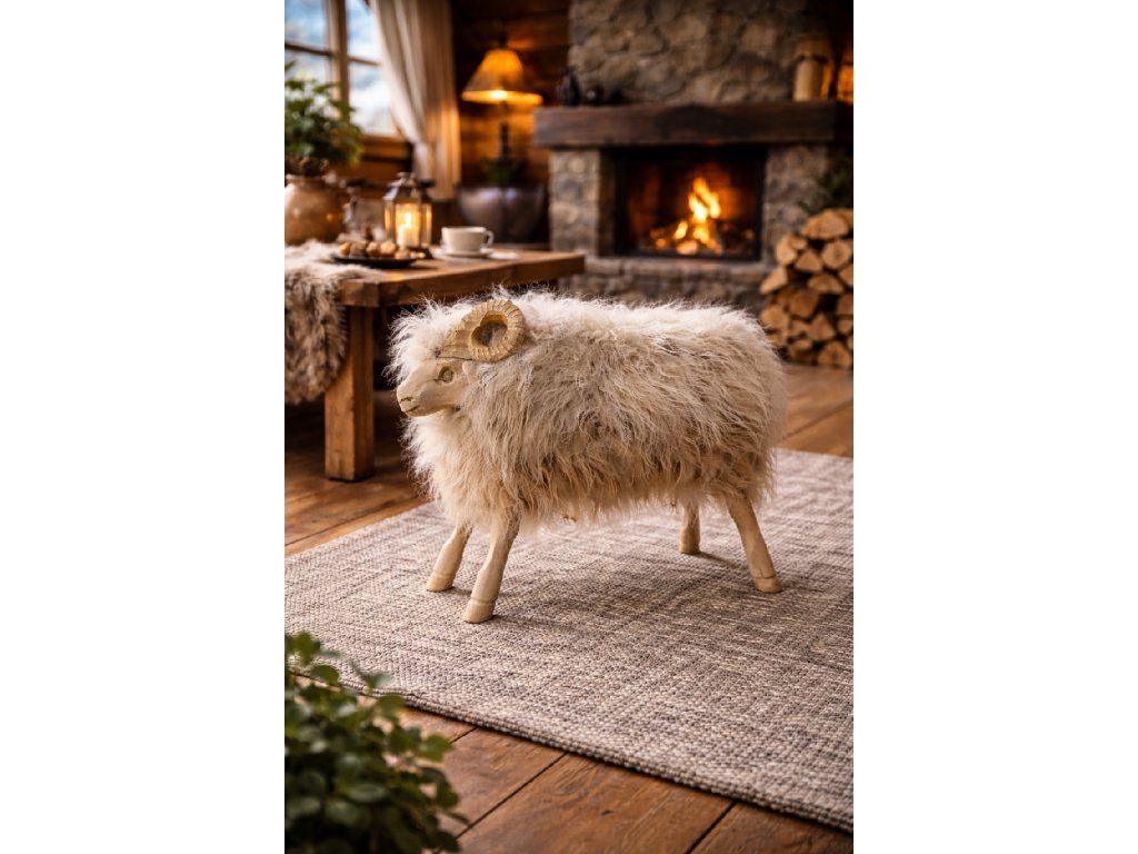🐏 Velik bež stol Baran – ročno izrezljan dizajn z pravo ovčjo kožo 🐑