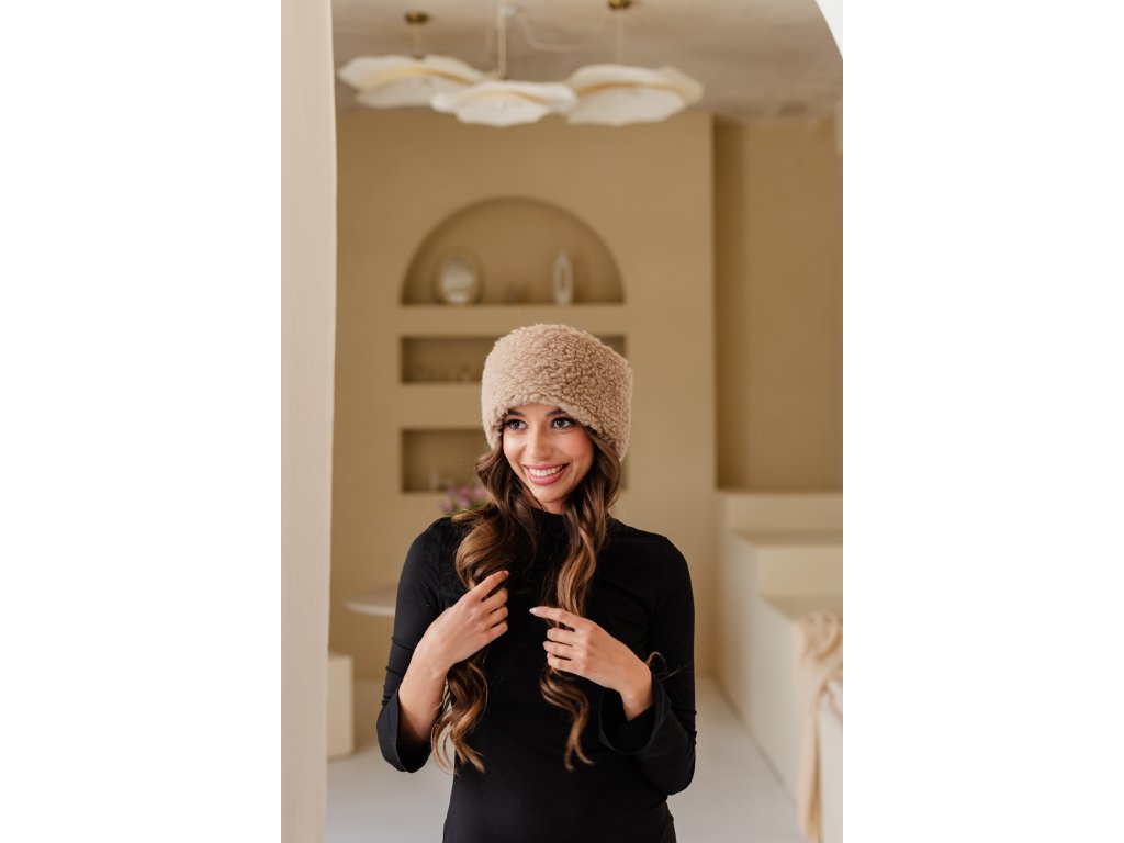 Bež volnena naglavna traka iz visokokakovostne merino volne zagotavlja popolno toplotno udobje in eleganten videz za hladne dni.